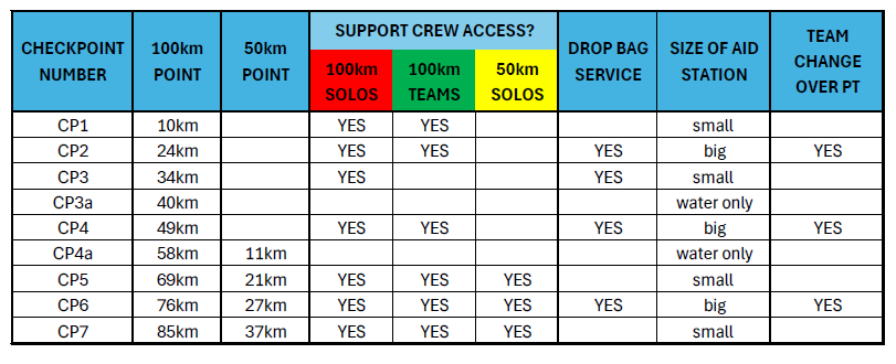 50km competitors may receive external assistance from support crew and/or team mates at any checkpoint along the course at the following locations: